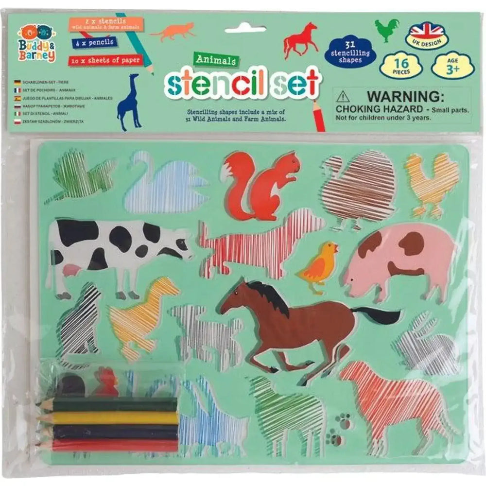 A double pack of sturdy stencils with 4 pencils and 10 sheets of paper.