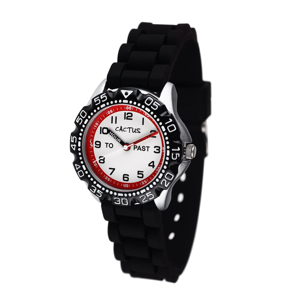 This sporty watch has the words hour and minutes on the hands to help children with telling the time. Fitted with a comfortable silicone watch band, this attractive watch is for everyday use