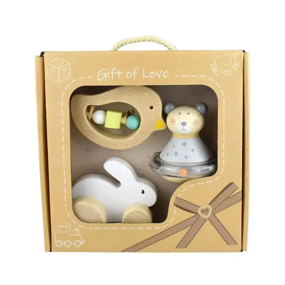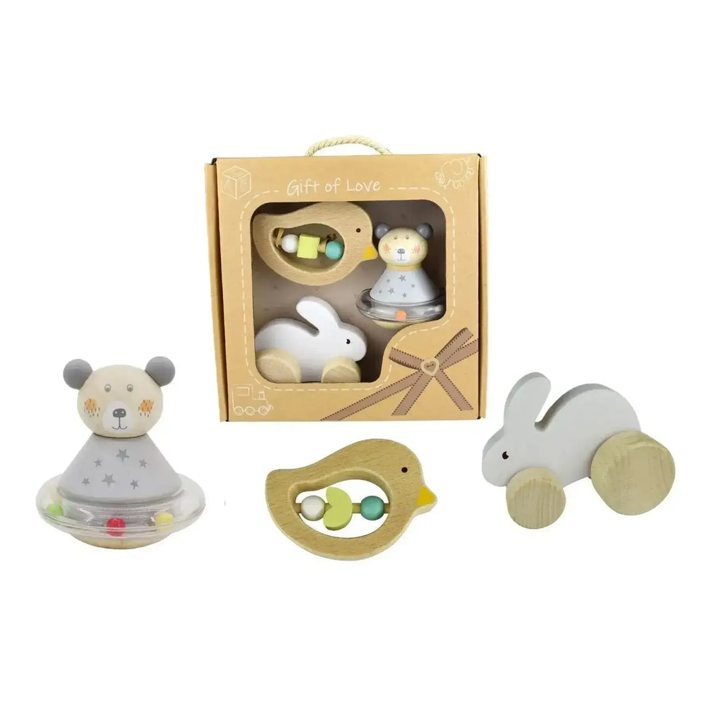 This set of toys is the perfect selection for newborn and up.Β Β Each boxed set includes a wooden teether, roly poly rattle and a push toy bunny.
