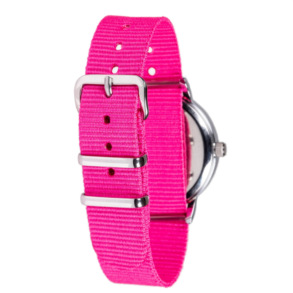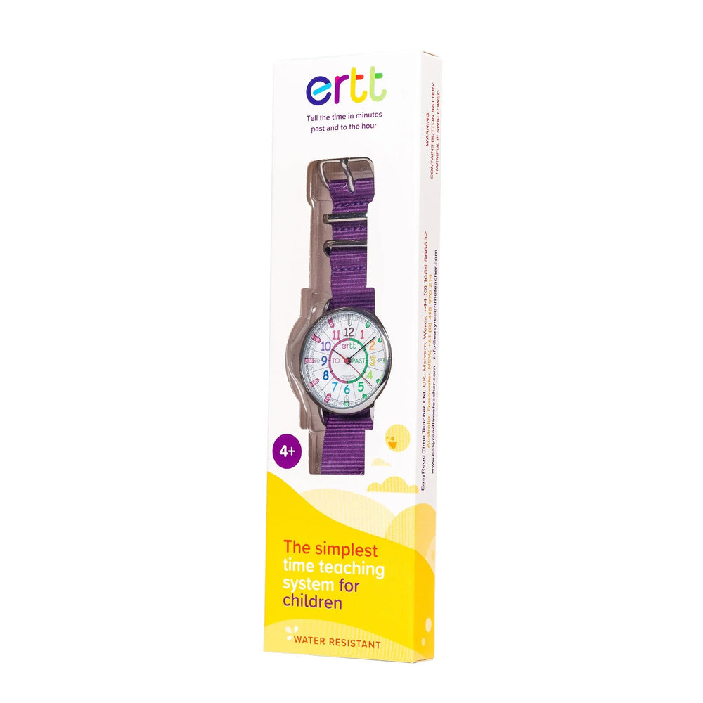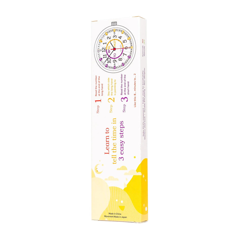 This Time Teacher Watch is suited for children age 4+. They have a white face with rainbow markings and a Past/To format. Case size 33mm, purple nylon strap. Seiko PC21s movement. Stainless steel back. Splash proof.