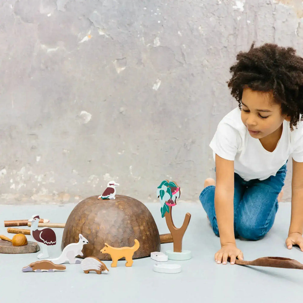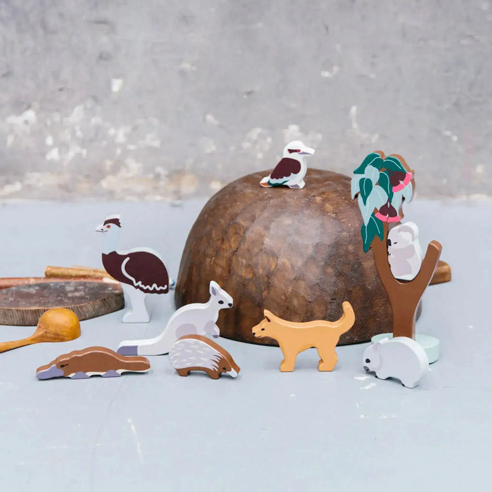 Complete with 1 x Gum Tree plus 8 native Aussie Animals including a Kangaroo, Platypus, Wombat, Emu, Kookaburra, Dingo, Echidna and a Koala who loves to sleep snug in a tree!