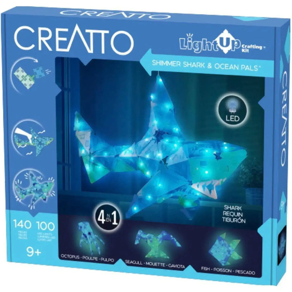 Shimmer Shark and Ocean Palsย includes 140 Creatto pieces, a string of 100 LED lights, and assembly instructions to build a shark, octopus, seagull, and fish, but the possibilities are limited only by your imagination! What will you create?