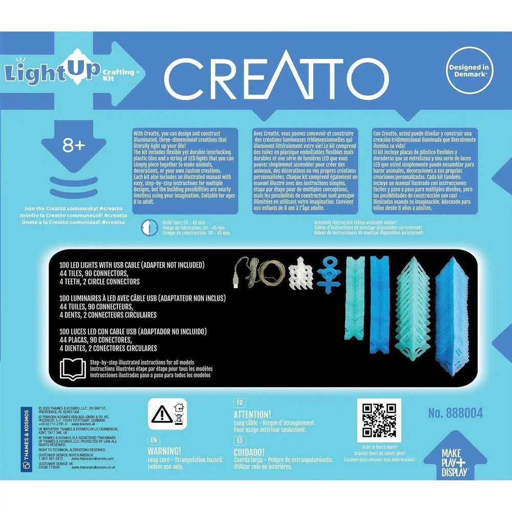 With CREATTO, you can design and construct illuminated, three-dimensional creations that literally light up your life! The kit includes flexible yet durable interlocking plastic tiles and a string of LED lights that you can piece together to make animals, decorations, or your own custom creations. Each set includes an illustrated manual with easy, step-by-step instructions for multiple designs, but the building possibilities are nearly limitless using your imagination.