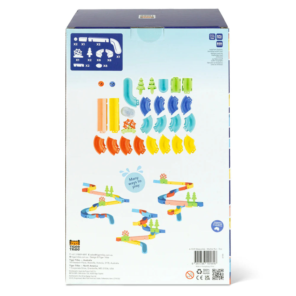 Made from eco-friendly bioplastic and designed for easy play, the Waterslide Marble Run attaches securely to bath or shower tiles with suction caps and can even be set up on windows for outdoor water play.